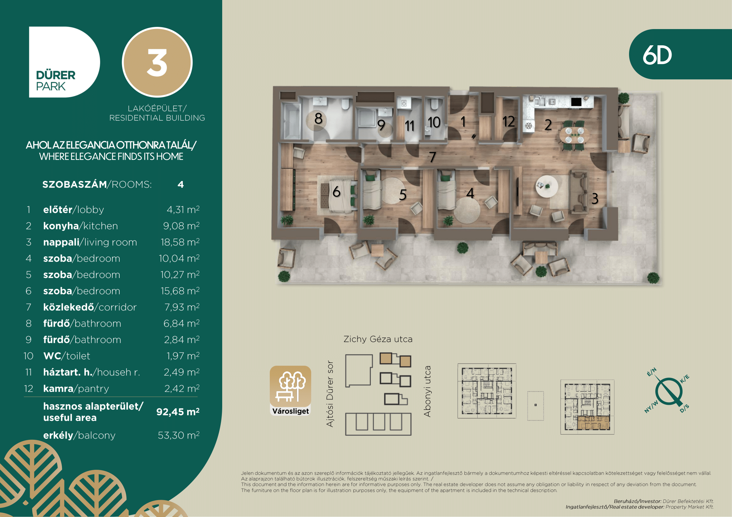 | Apartment DPR3_A.02.02 | Size 92.45 m2 | Room numbers 4 | Floor 2. | Orientation Délnyugati |