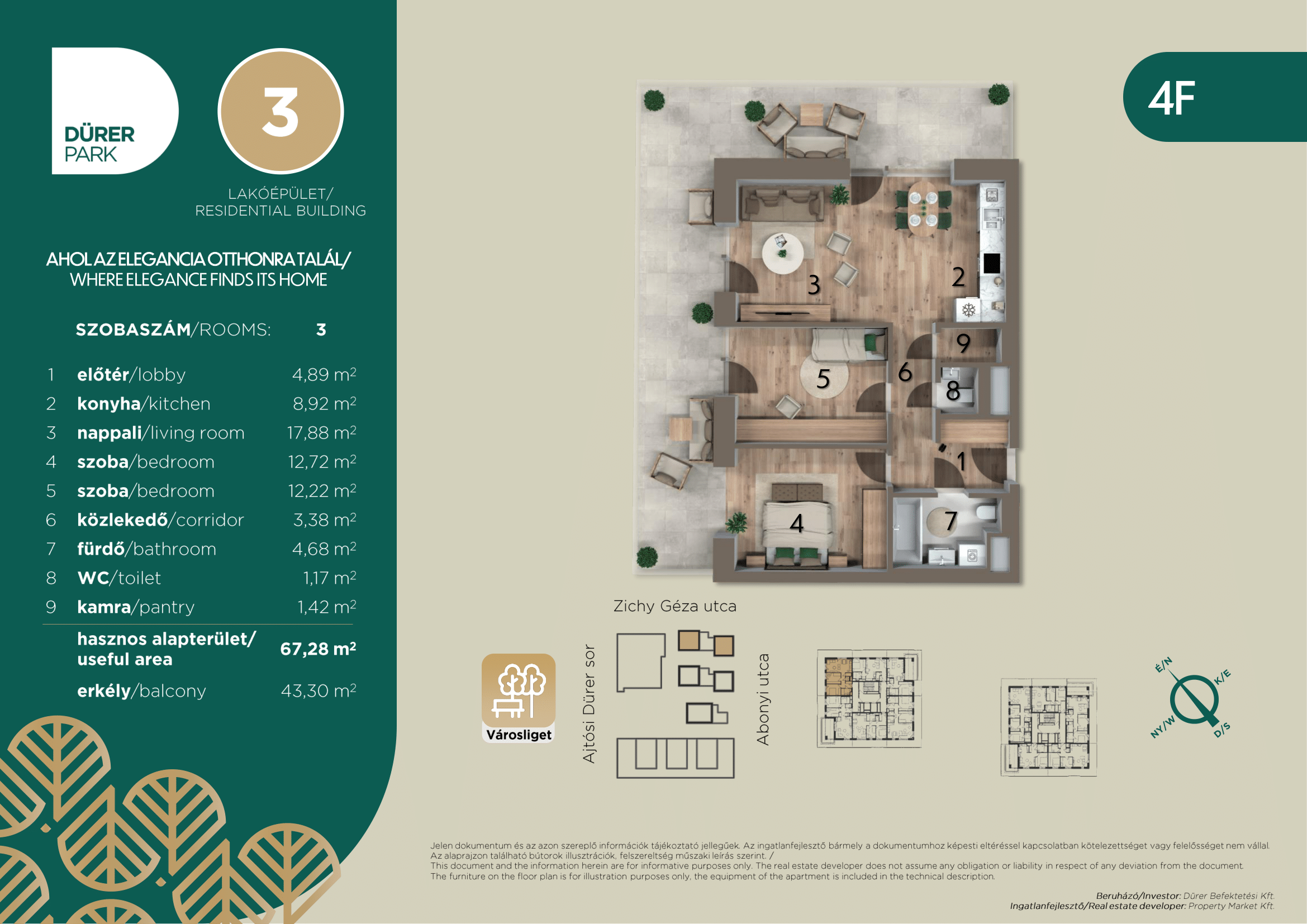 | Apartment DPR3_B.05.05 | Size 67.28 m2 | Room numbers 3 | Floor 5. | Orientation Északi |