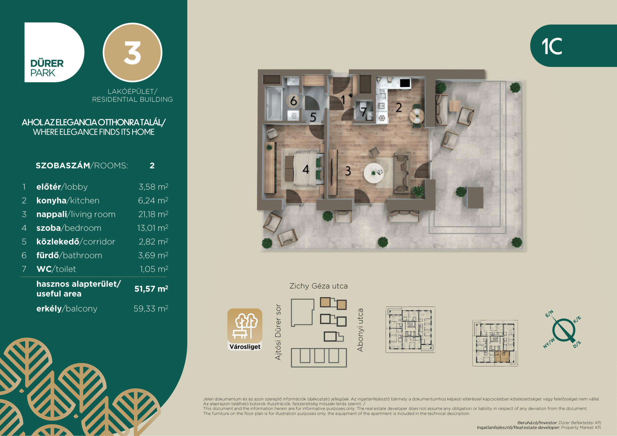 | Lakás DPR3_A.03.02 | Alapterület 51.57 m2 | Szobaszám 2 | Emelet 3. | Tájolás Délnyugati |