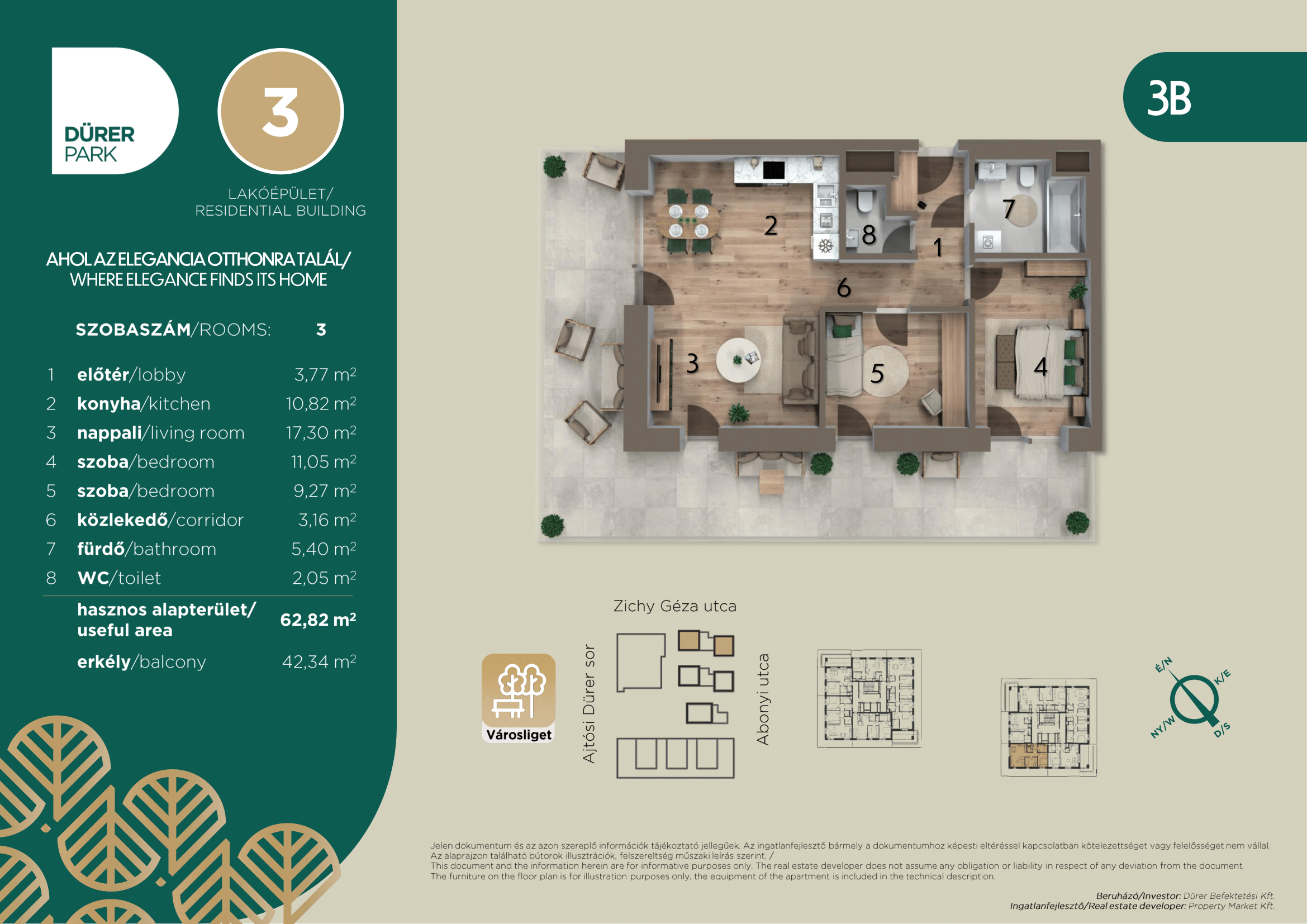 | Lakás DPR3_A.03.03 | Alapterület 62.82 m2 | Szobaszám 3 | Emelet 3. | Tájolás Nyugati |